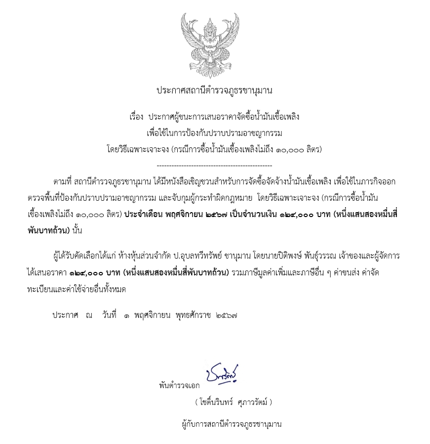 สภ.ชานุมาน เรื่อง ประกาศจัดซื้อน้ำมันเชื้อเพลิง พฤศจิกายน 2567