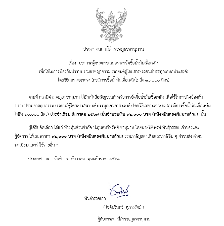 สภ.ชานุมาน เรื่อง ประกาศจัดซื้อน้ำมันเชื้อเพลิงรถยนต์ตู้โดยสาร/รถยนต์เอนกประสงค์ ธันวาคม 2567