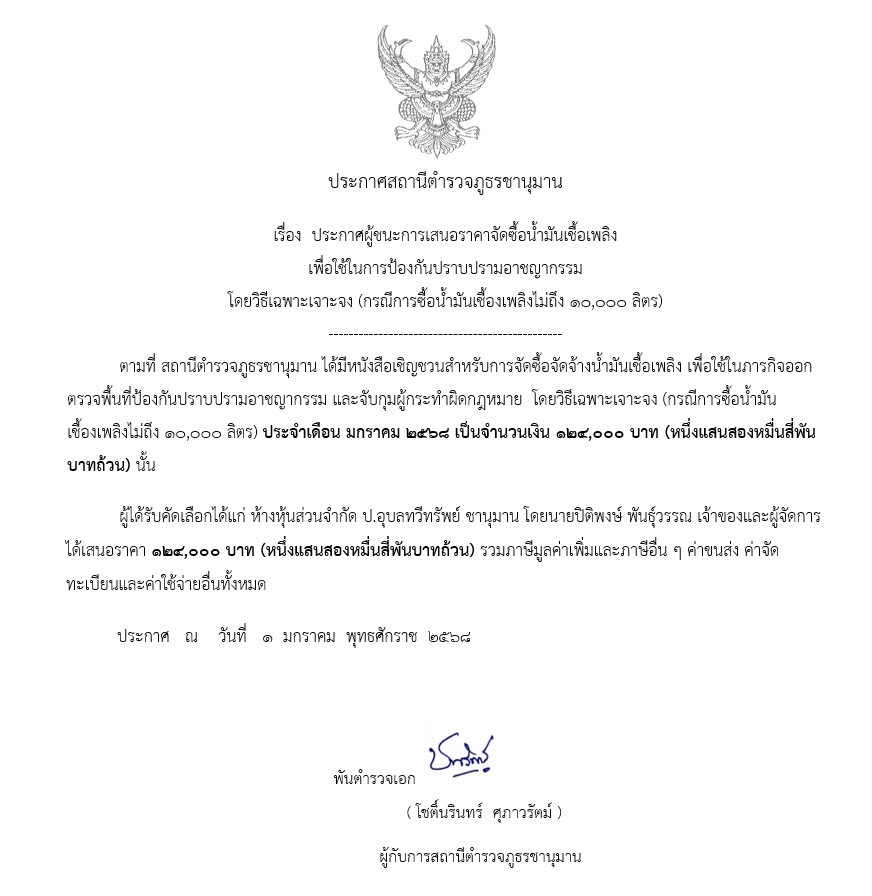 สภ.ชานุมาน เรื่อง ประกาศจัดซื้อน้ำมันเชื้อเพลิง มกราคม 2568