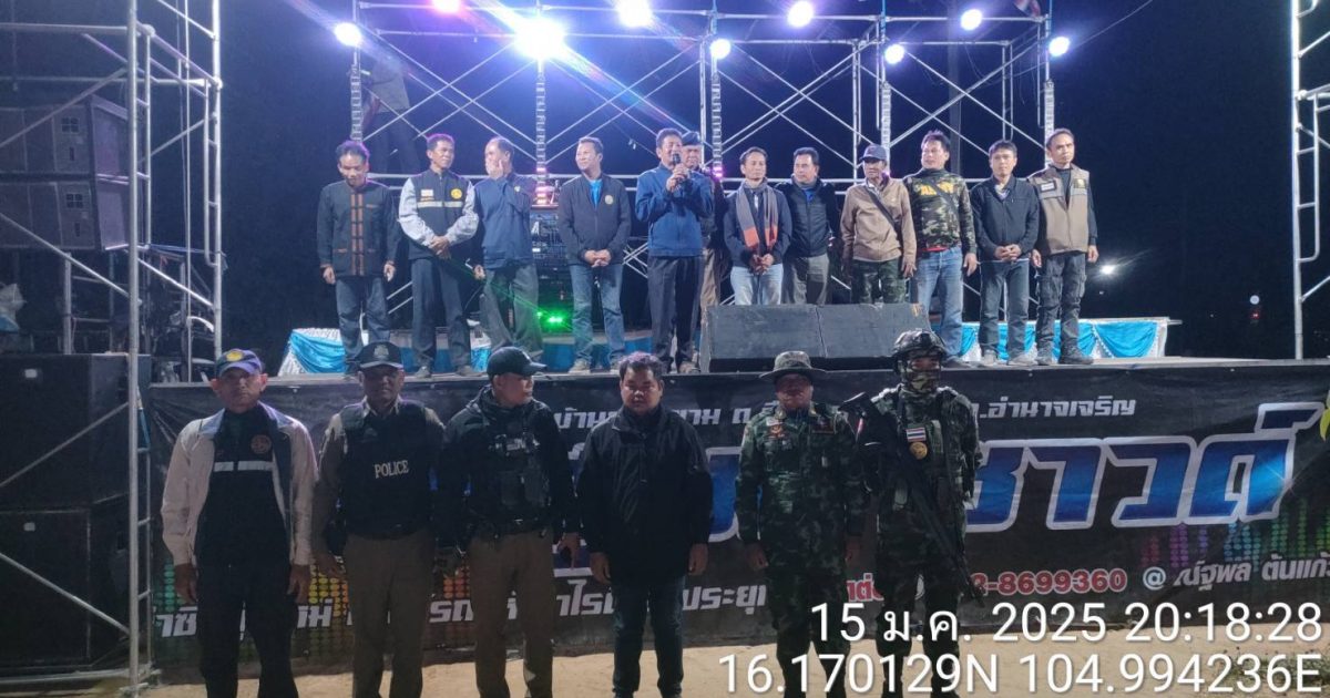 สภ.ชานุมาน ภ.จว.อำนาจเจริญ วันนี้ 15ม.ค.67 เวลา 20.00 น. พ.ต.ท.ปุณยวีร์ ชินพา สวป.สภ.ชานุมาน /ผู้ควบคุมการปฏิบัติ ร.ต.ท.เมืองมนต์ มาระแสง รอง สว.(ป.)ฯ /หน.ชุด รปภ. พร้อมด้วย จนท.ตำรวจ ตามคำสั่ง สภ.ชานุมานที่ 15/68 ลง 14ม.ค.68 ร่วมกับ ผู้นำชุมชน /อปพร./ ชรบ.ได้ร่วมกันประชุมแจ้งการปฏิบัติและได้ปล่อยแถวออกปฏิบัติหน้าที่ งานทำบุญมีการแสดงหมอลำซิ่ง ยอดกำลังพล รวม 20 นาย สถานที่ บ้านเลขที่ 229 ม. 9 ต.โคกสาร อ.ชานุมานจว.อำนาจเจริญ ห้วงเวลา 20.00น. – 24.00น./งานขนาดเล็ก