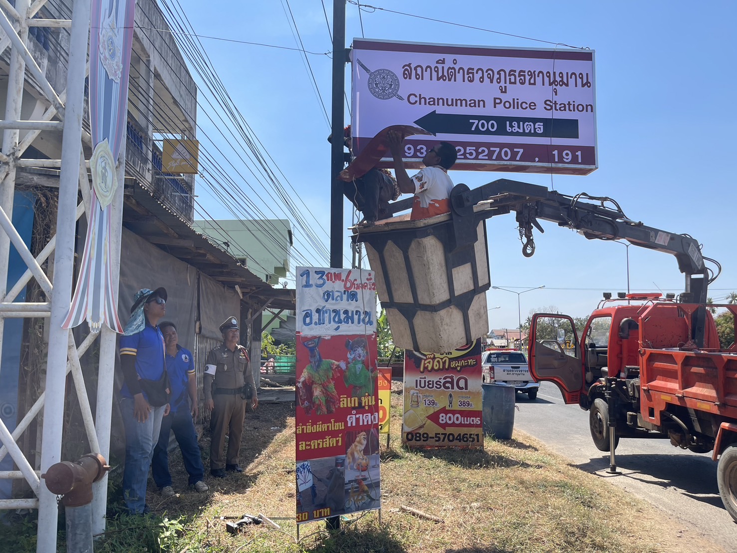 ร.ต.อ. สมชาย โสภาพงษ์ รอง สว.จร.สภ.ชานุมาน พร้อมด้วยชุดจราจร ได้ดำเนินการซ่อมแซมและติดตั้งป้ายสถานีต