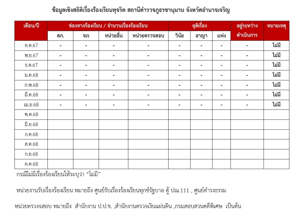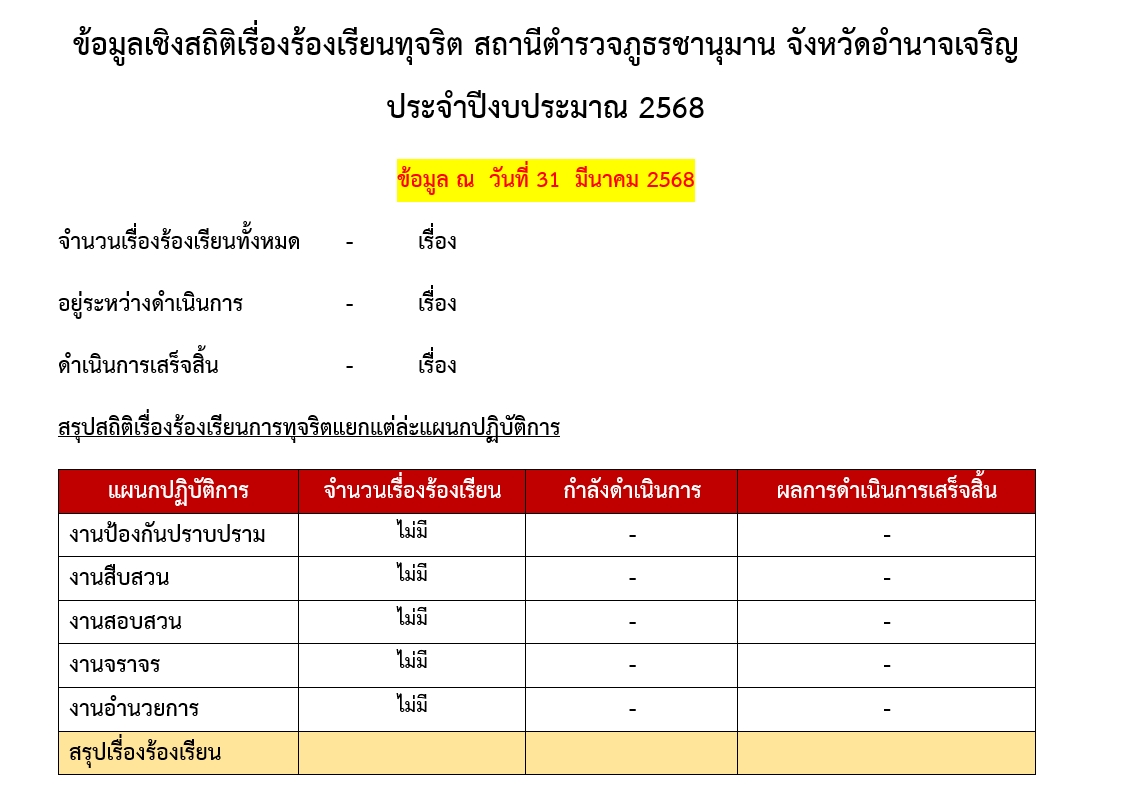 ข้อมูลเชิงสถิติเรื่องร้องเรียนทุจริต สถานีตำรวจภูธรชานุมาน จังหวัดอำนาจเจริญ ประจำปีงบประมาณ 2568