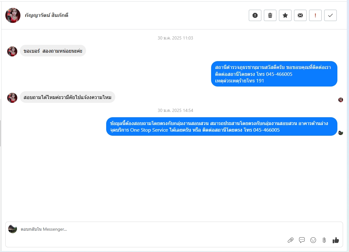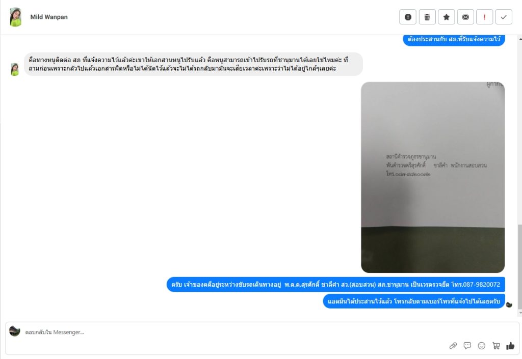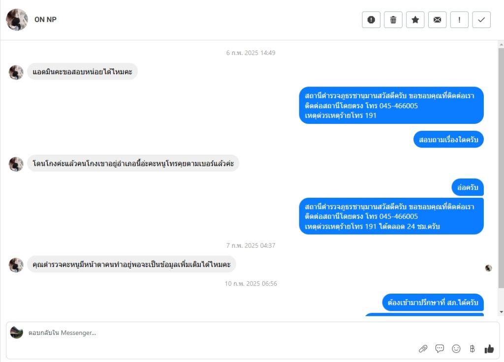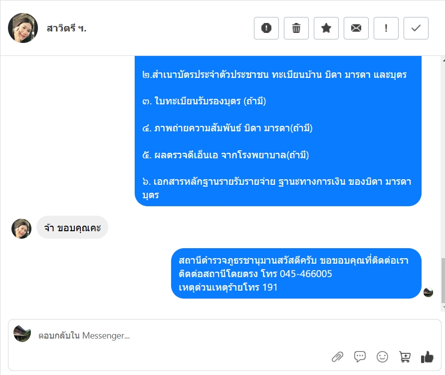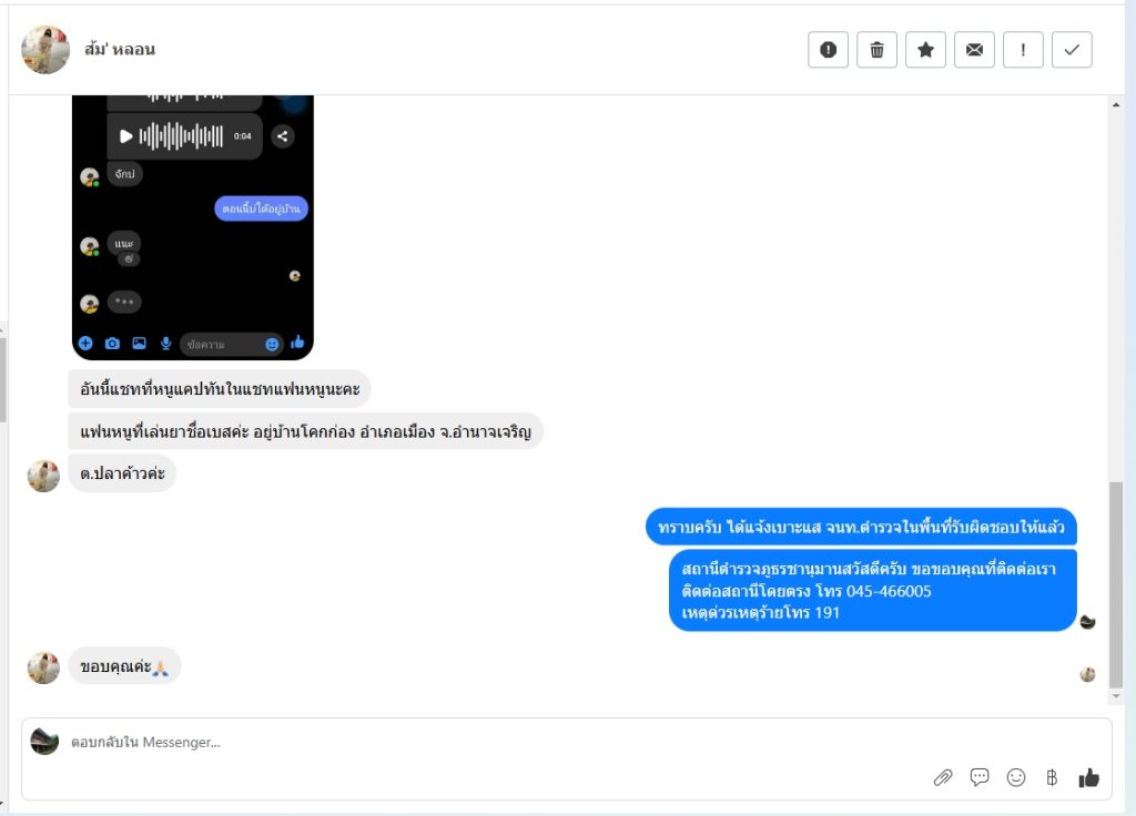 4. ติดต่อสอบถามผ่านช่องทาง Massenger และแสดงความคิดเห็นได้โดยตรงผ่าน แฟนเพจ Facebook ของสถานีตำรวจภูธรชานุมาน